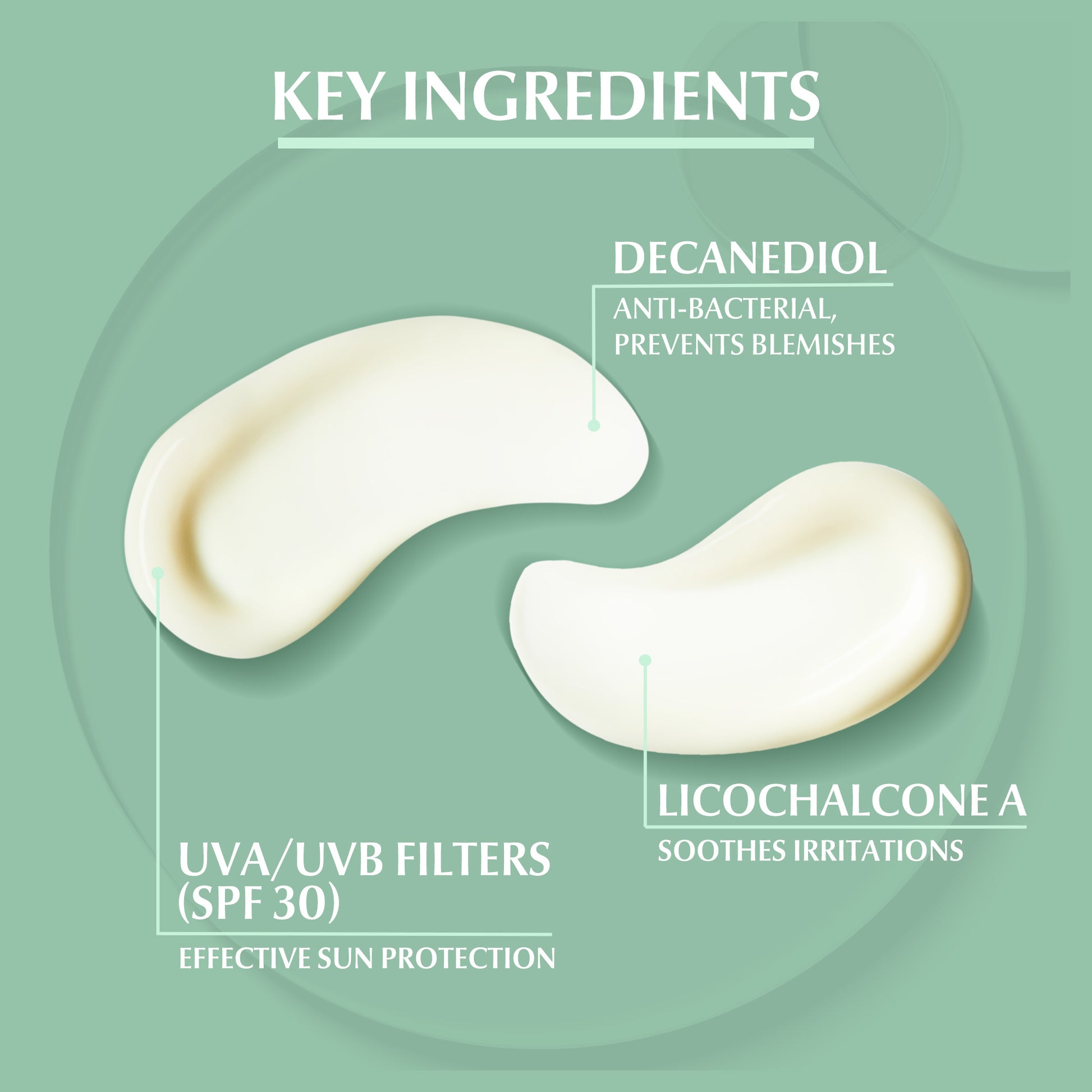 - يساعد على منع الشوائب ويتغلب أخيراً على علامات ما بعد حب الشباب بثلاثة عوامل رئيسية: مكافحة العلامات الداكنة ومقاومة الشوائب واللمعان. يقوم SPF30 UVA / B بتصفية بشرتك من التغميق الناجم عن الشمس لعلامات ما بعد حب الشباب ويمنع ظهورها مرة أخرى بينما تساعد مكونات ديكانيديول على منع الشوائب وتهدئة التهيج، على التوالي. يتكون هذا السائل أيضاً من تقنية تنظيم الزهم التي توفر لمسة نهائية جافة وطويلة الأمد