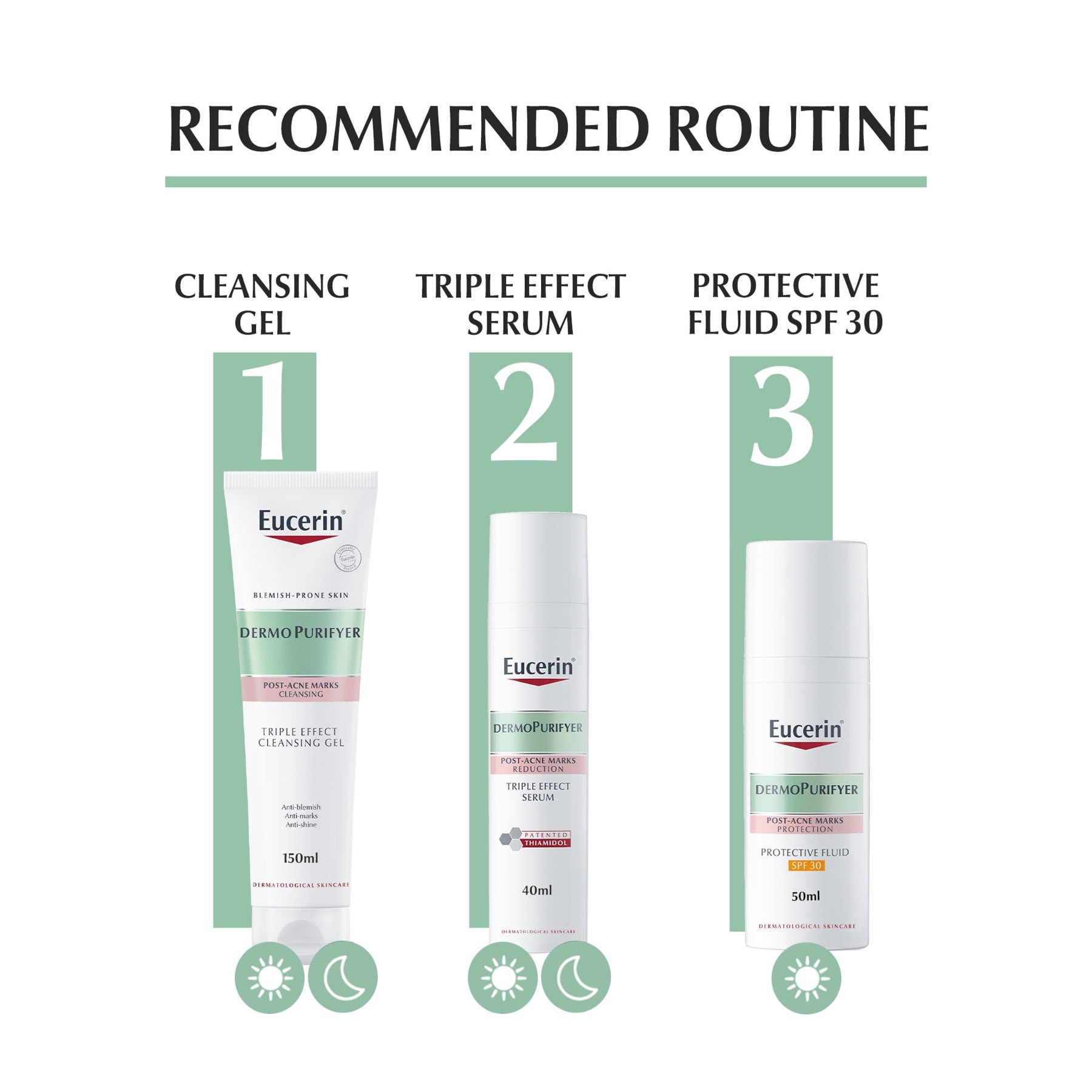 - روتين كامل للبشرة غير النقية: احصلي على عناية كاملة للبشرة غير النقية مع مجموعة Dermopurifyer الكاملة من Eucerin - 1) جل التنظيف، 2) مصل ثلاثي التأثير، 3) سائل وقائي SPF30، 4) كريم مهدئ إضافي، والمزيد.