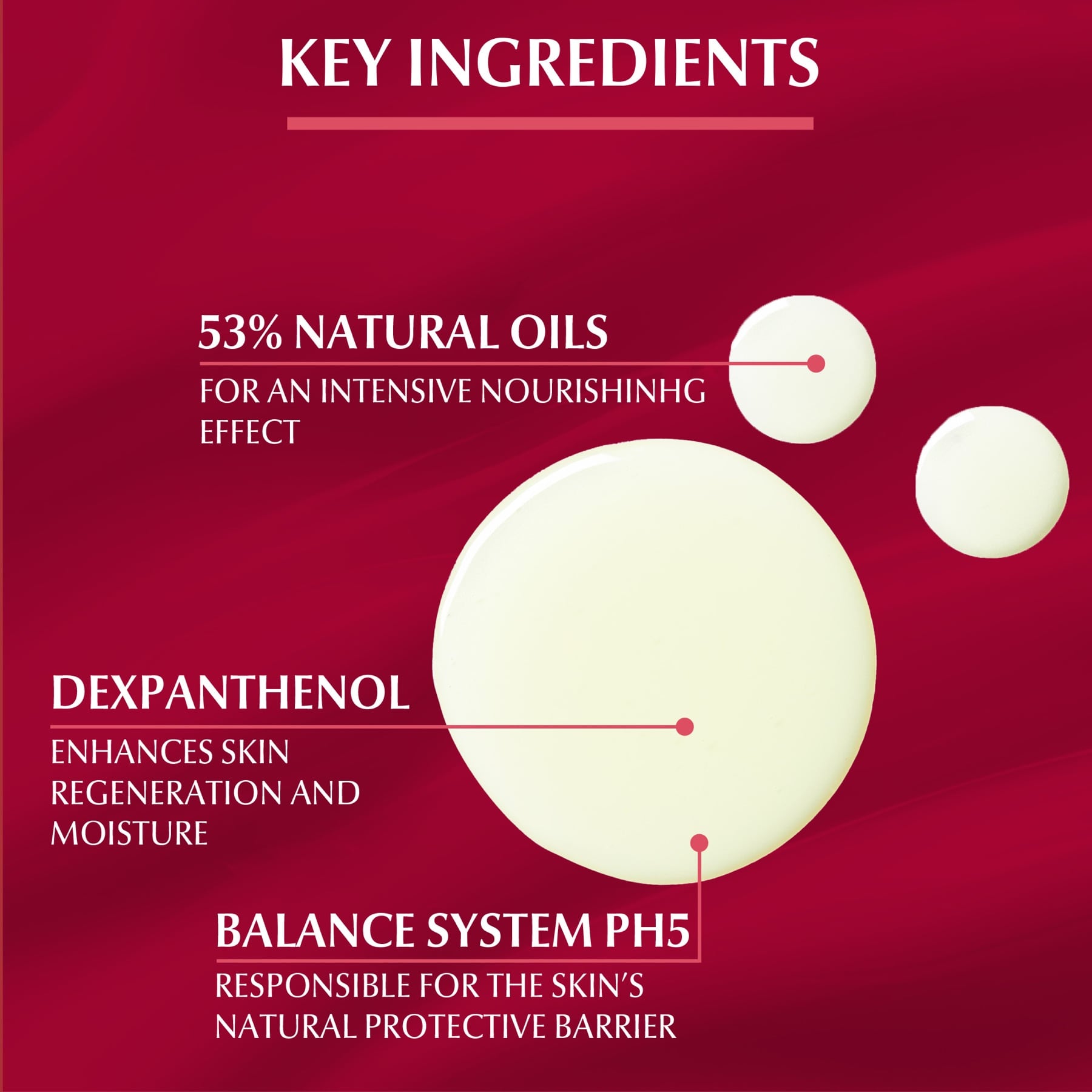 - مع زيوت العناية الطبيعية للتغذية المكثفة: تركيبته الغنية والمتجددة تحتوي على 53% من الزيوت الطبيعية التي تغذي البشرة بشكل مكثف، مما يجعلها تشعر بالدلال والنعومة الحريرية، وتمنعها من الجفاف حتى بعد الاستخدام المتكرر.