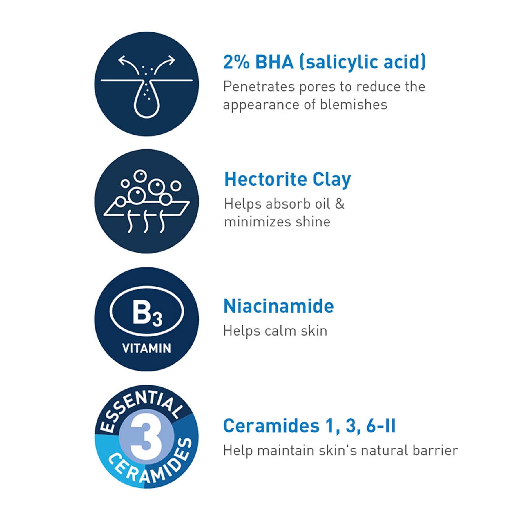 - Developed with dermatologists, a gel-to-foam cleanser with 2% salicylic acid and purifying clay to remove dirt & excess oil, clean pores, gently exfoliate, and deeply reduce oiliness while helping to not disrupt the protective skin barrier or cause dryness and discomfort with 3 essential ceramides. Featuring Oil-Absorbing Technology to minimize visible shine. Formulated to clear acne, reduce blackheads, and improve the appearance of pores. 2% salicylic acid: Treats acne and penetrates pores to help prevent new breakouts Hectorite clay: Helps absorb oil and helps skin look less shiny Ceramides: Help maintain the skin’s natural barrier Niacinamide: Helps calm the skin Non-comedogenic Fragrance- and paraben-free Allergy-tested Dermatologist recommended