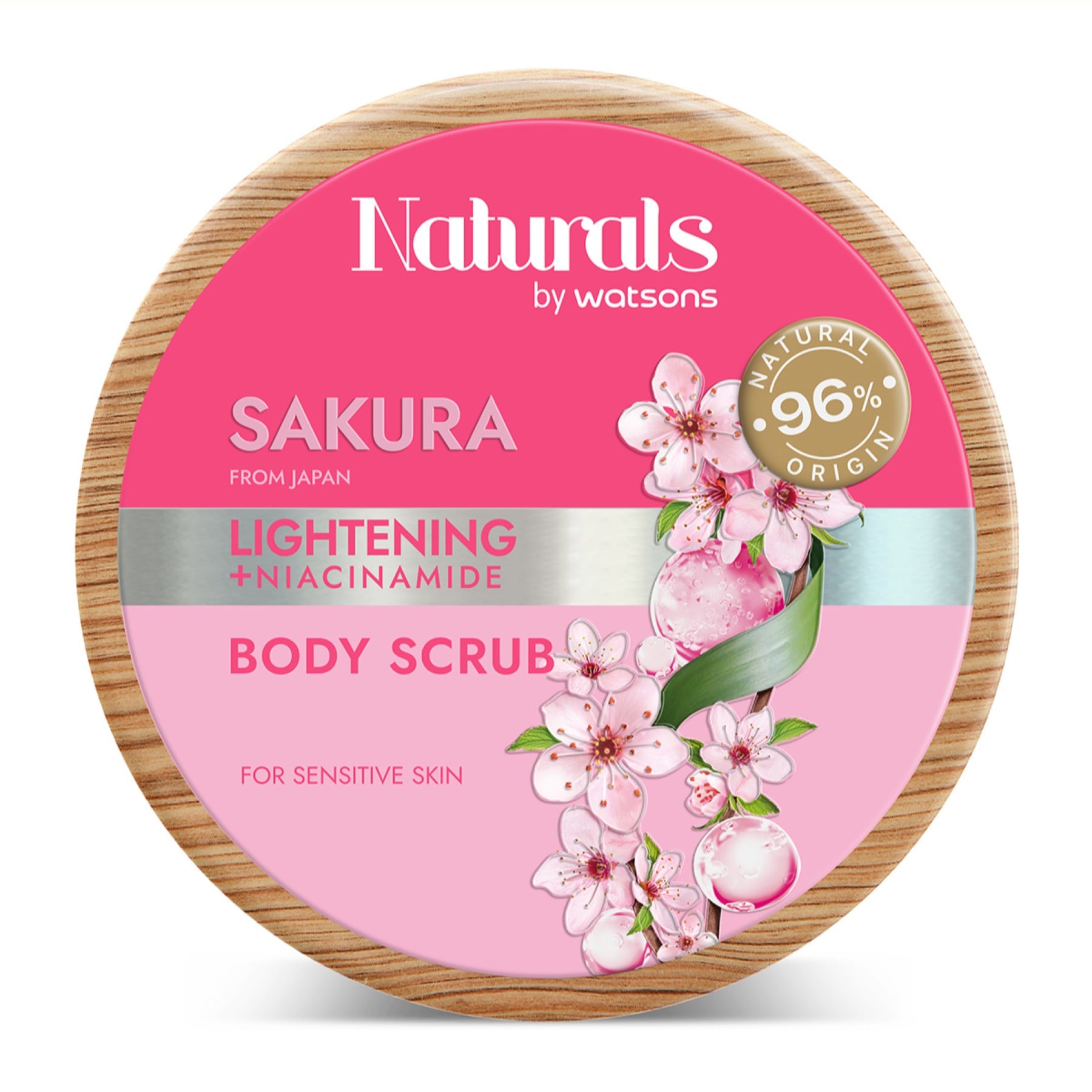 - During your bath or shower, apply an appropriate amount of Naturals by Watsons Sakura Body Scrub onto your palm. Gently massage all over your body. Greater pressure can be applied to rough areas such as elbows, heels and knees for better results. Rinse off thoroughly with water. For optimal results, use it twice a week in conjunction with the rest of Naturals by Watsons Sakura Bath & Body Care range